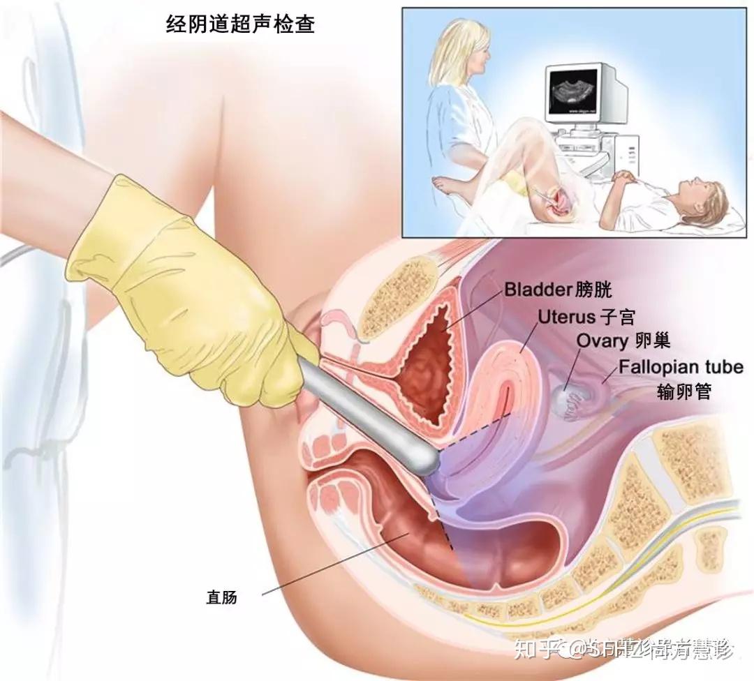 在经阴道超声检查中,在女性阴道内放置传感器探头,以获得更好的子宫和卵巢图像。